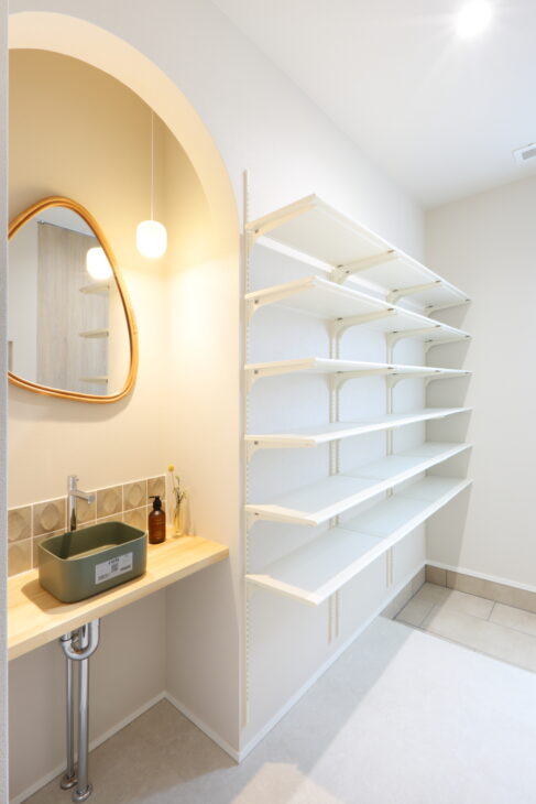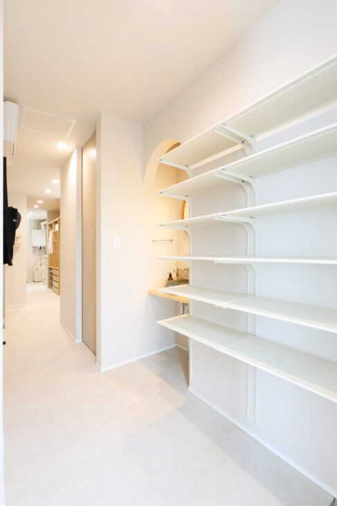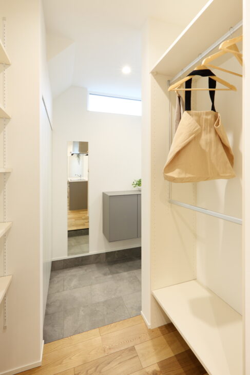 奥の扉を開けると、シューズクローゼットや洗面化粧台、ファミリークローゼット等がある一直線の水回り動線へと繋がります。